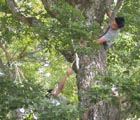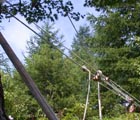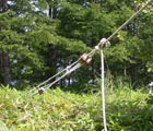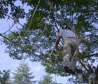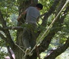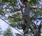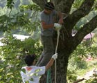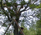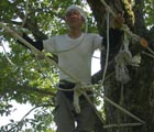 渡り綱を丈夫な木に滑車でしっかりと固定する。