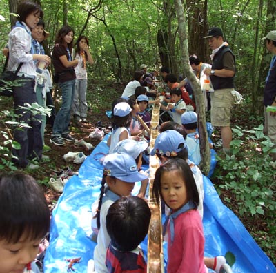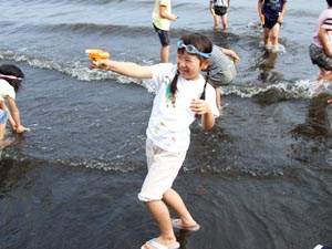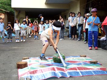 次はスイカ割り。3つのスイカをみんなで割った。不思議に全員まわって最後は原隊長がとどめ!。ボーイ隊見学もした↓