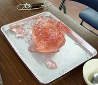 バケツゼリー↓お姉さんの持ってるバケツで作ったんだ!イチゴ・メロン・ぶどうの三色。残った分量は3つとも同じ。かなり甘い。