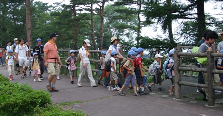これが山中湖↑3日目の朝ハイキング。晴れているがかすんで富士山は見えず。残念。ベンチャーのお兄さんが監視員