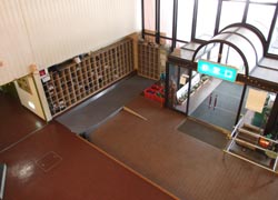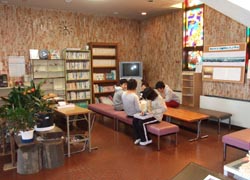 左写真は玄関を入って正面に見える。階段下が次写真の談話室。右写真が入口玄関。下左写真が玄関先だ。