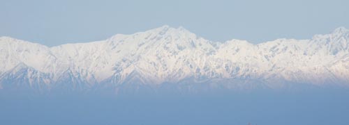 この玄関先から遠方右方向に目を移すと右写真の2日目朝日に輝く北アルプス連峰が見える。(2階研修室から撮影)