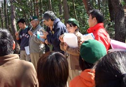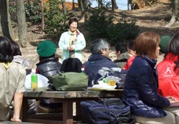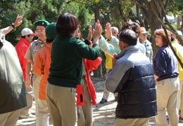 ▲公園内では北野講師 手作りの竹笛が配られ野外演奏会。まあるい命・おもちゃのチャチャチャ(笛の調律は 根津副コミ)