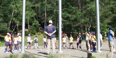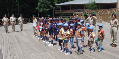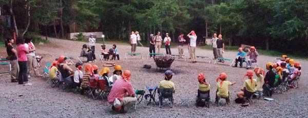 ▲テントの設営を完了してからカブコールと隊セレモニー。だいぶ時間が押されて西陽になってきた。