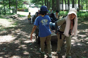 ▲駐車場から約1kmほどリヤカーで全ての荷物を運ぶ。ゆるやかな登り坂なのでたいへんだ !!