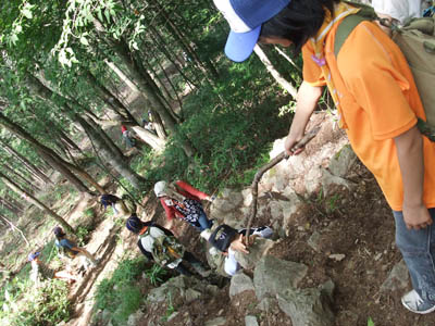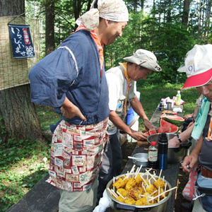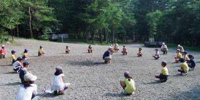 荷物を運び終えて設営。今回テントと炊具はキャンプ場の物をかりた。スカウトはA型テント。ペグをたくさん打たないといけない。