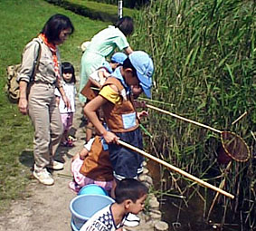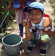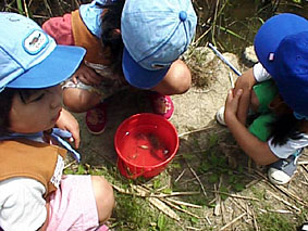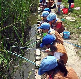 台風一過の晴天の下、朝10時から11時までみんなで頑張ってザリガニを釣りました。