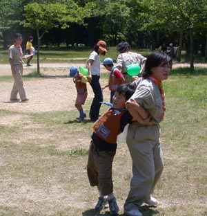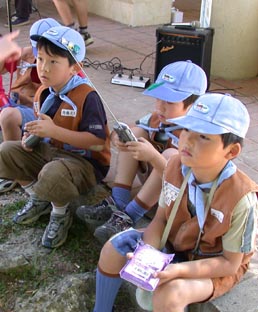 ビーバースカウトは親子で参加。公園内をラジオを持って走り回り電波の発信源を探していた。