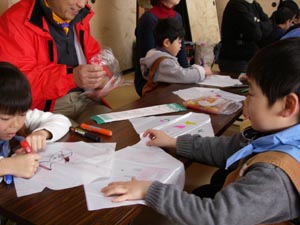 コミセンで自分のタコにきれいな絵を描いて5個のタコをつなぎ合わせる。