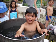 ドラム缶風呂も人気のひとつだ〜。頭までもぐって汗を落とす。みんな楽しそ〜\(^o^)/
