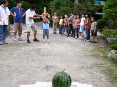 そして、スイカ割り。神様のみちびきで全員まわって最後のスカウトがスイカを真っ二つ!! すごすぎ〜 ヽ(∩o∩)ノ