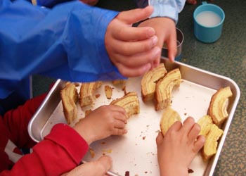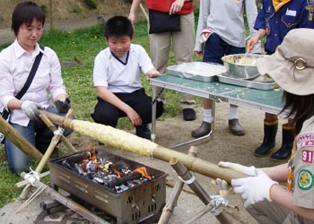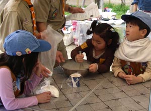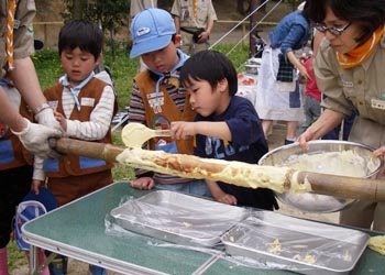 スカウトはバームクーヘンの生地作りのお手伝いから
