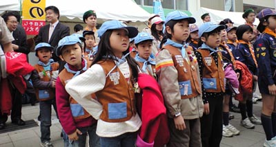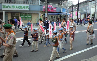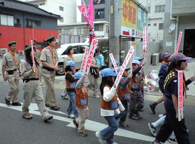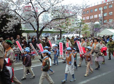 肌寒い中、みんな元気にプラカードを持ってパレードの行進だ。みんな揃って歩いているかい?