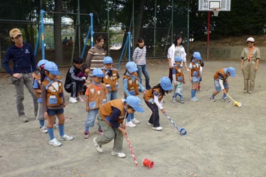 まずは棒でコマを転がしながら競争。棒がやわらかくて、スカウトたちはコマを転がすのに大苦戦。