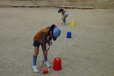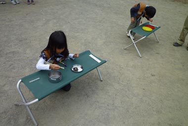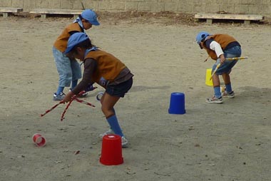 こんどは同じコマを2本の棒ではさんで持ち運ぶレース。なかなか上手に運んでるぞ!