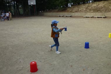 ビーズを10個移し替えたら、ケンケンでお菓子のパイの場所へ移動。ここでつかんだパイは今日のおやつです!