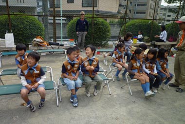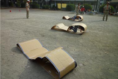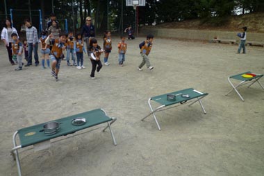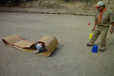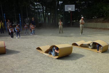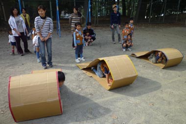 次は段ボール製のキャタピラの中に人が入ってこれを動かすレース。身軽なスカウトたちでもこれは結構大変な運動。