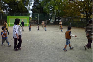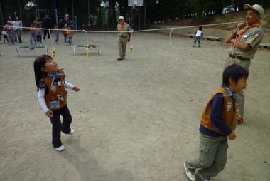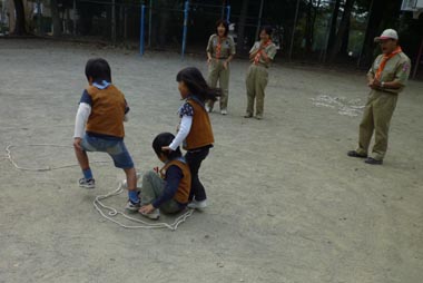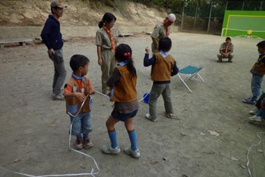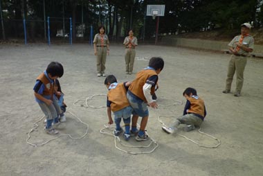 さらに“本結び”でつくったロープの輪を使った、“いすとり”ならぬ“陣取り”ゲーム。あ、あっちがあいてるぞ!