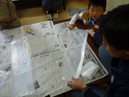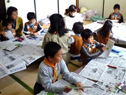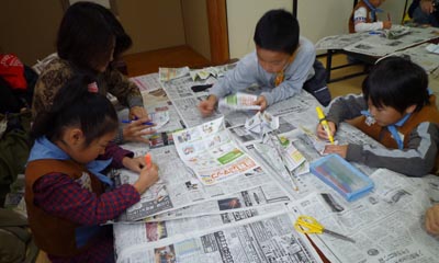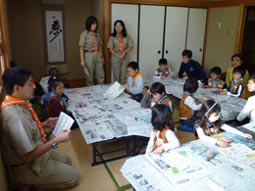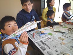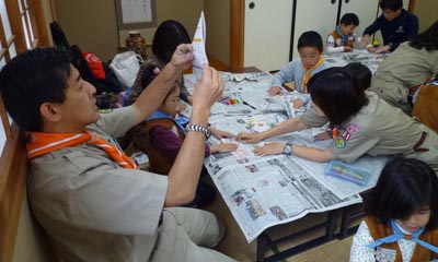 はじめはコミセンの部屋で工作から。隊長から紙飛行機の作り方の説明を受けた後、作業開始。ほら、うまくできた!!