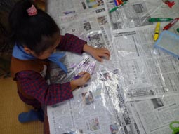 次はビニール袋を使って落下傘の作成開始。袋を適当な大きさに切って、カラフルに模様をつけます。さらにタコ糸・PETボトルをつけて完成。