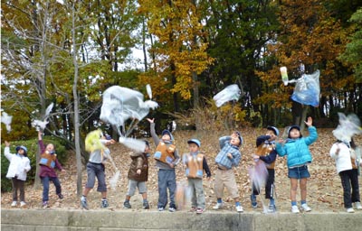 作品ができあがり、隣の公園でみんなで一斉に飛ばしあいをしました。一番良く飛んだのは誰の落下傘かな?