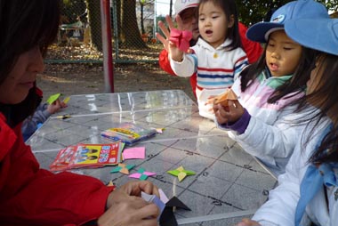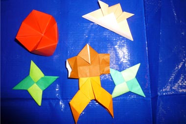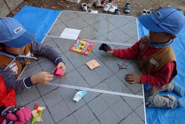 こちらは折り紙遊びの様子。みんないろんな折り紙を作って楽しそう!やっこさんや手裏剣、かぶとなど、いろんな作品ができあがりました!