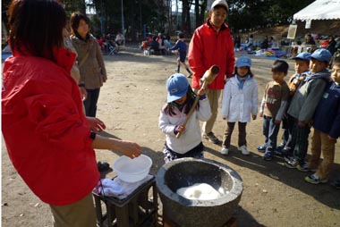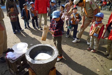 スカウトが折り紙している間にもちつきの準備が整いました。団委員につづき、スカウト達ももちつきに挑戦!みんな、やるじゃないか!