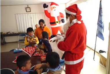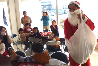 こちらはみんなで準備したプレゼント交換と、サンタさんからのプレゼント配布の様子。このサンタさん、何だかで見たことがありそう・・・?!