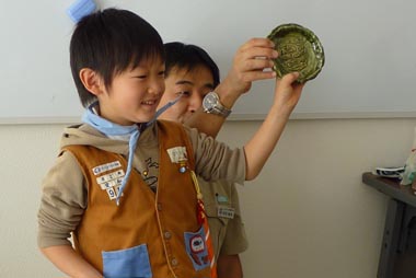 プレゼント交換の後は、11月に陶磁資料館で作った陶芸品の発表会。みんな自分の作品を元気一杯発表しました!