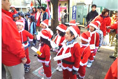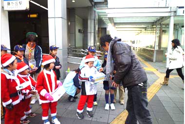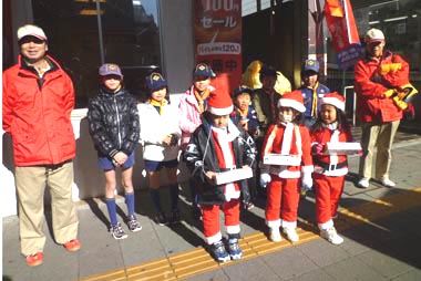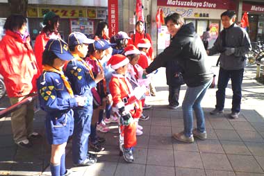 ちょっと早めのお昼ご飯のあと、スカウトたちはサンタの格好に着替えて、藤が丘駅前に移動して募金活動開始。