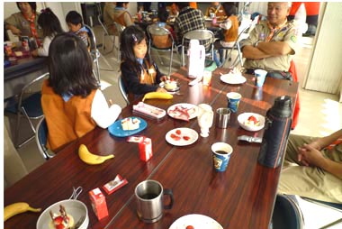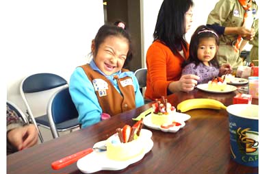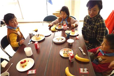 コミセンに戻って、いよいよお楽しみのケーキの時間です!みんな好きなようにトッピングして“いっただきまーす”!