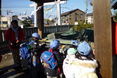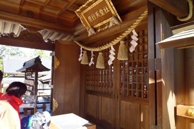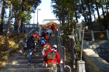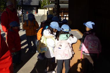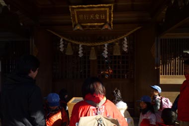 階段を登って拝殿に到着後、用意しておいたお賽銭を賽銭箱に入れ、拝礼。みんな、何を祈願したかな?