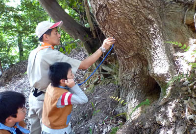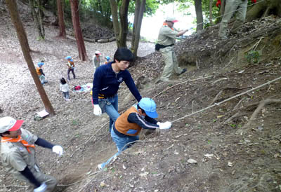 ▲今からこのガケを登ります!大丈夫かしら・・・ ▲リーダーが要所を固めて安全確保に努めます。