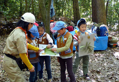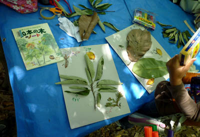 ▲貼り付けた葉っぱを図鑑で調べて ▲それぞれ何の木の葉っぱか発表しました。