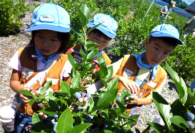 藤が丘を出発してバスで約2時間、最初の活動のブルーベリー狩りだ!ブルーベリーが10種類以上もあるなんて知らなかった!ブルーベリーは目にイインダヨ!
