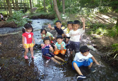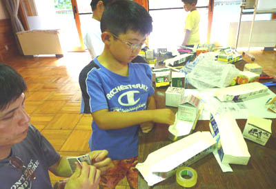 ▲お弁当の後に工作室でゴム動力船をつくったよ。 ▲このあと、宿舎の前を流れる硫黄沢(いおうさわ)で競争だ!