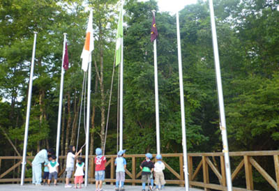 ▲みんなで競争してみんなビショぬれ。キモチいいね! ▲一日の行事が終わるとゆうべのつどいがある。旗をうまく降ろせるかな。