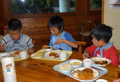 ▲食事はバイキング形式だ。残さずキレイに食べられるかな。 ▲肝試しのゴールで隠し撮りをしてみんなの驚く顔を撮ろうとしたけど。アレレ…