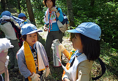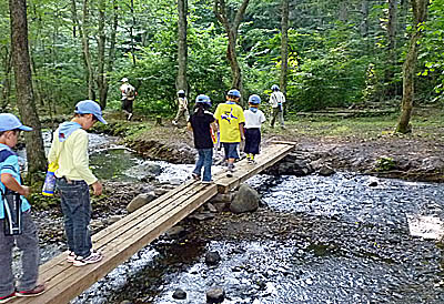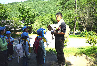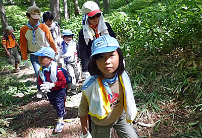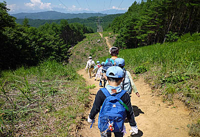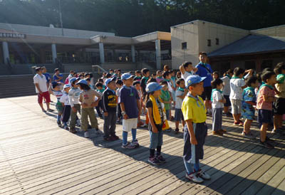 朝は自然の家全体で「あさのつどい」があります。朝から立派にならべたね!▲朝ご飯のあと、いよいよ「ハイキング」に出発だ!
