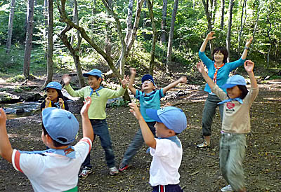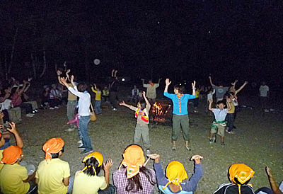 ▲今度は林の中の秘密の小路を通って宿舎に帰ろう。 ▲今日のもう一つのイベント大営火だ!ビーバーのスタンツ「幸せなら手を叩こう2!」