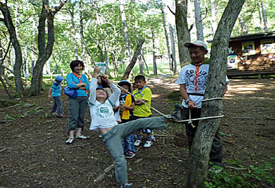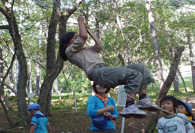 ▲お昼寝のあとに今晩の大営火のスタンツの練習。何だか楽しそう。 ▲スタンツの練習の後は木登り遊びで大ハシャギ!みんなサル系?!
