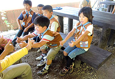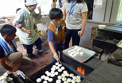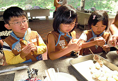 ▲朝の点検はキビシイぞ!掃除も活動のうち。 ▲今日の昼ごはんは五平餅。つまりこれからうまく作れなければお昼ナシ?!
