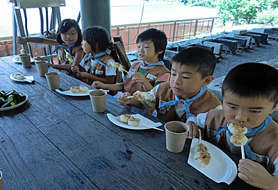 ▲火で焼いておいしくできたかな。まんぞく、まんぞく♪