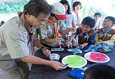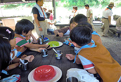 ▲寒天ゼリー大好評。 ▲食後はミニゲーム大会。リーダのネタ勝負!