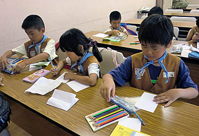 ▲集会室でご家族に楽しかった思い出のハガキ描き。何を描いた? ▲最後の活動”緑の宝探し”面白い”緑”のモノが見つけられるかな。