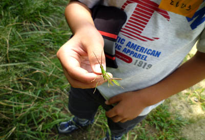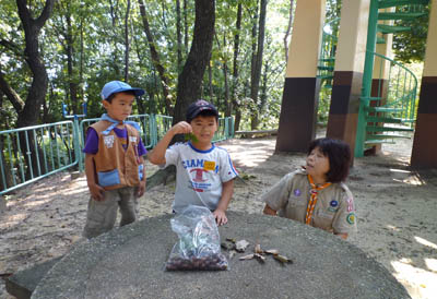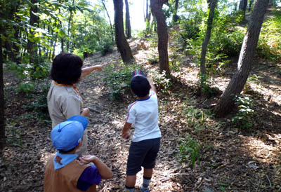 ▲訓練の前に明が丘公園の森を散策。秋はまだかと思っていたけどこんなにドングリが取れたよ。▲草相撲です。「かかってこいやー!」