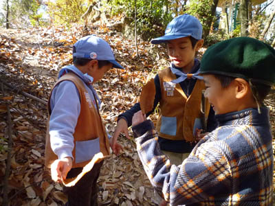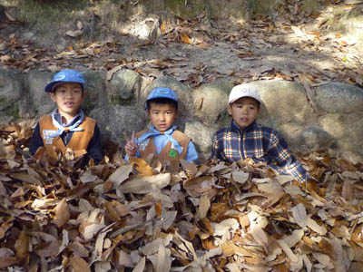 ▲おもちを食べてお腹一杯になったから裏山で遊ぼう! ▲落ち葉がものすごいね。みんなで集めて山にしよう!