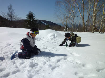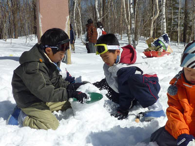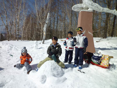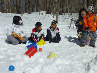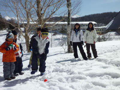▲ほかに父兄チームの芸術的な作品(海ガメ:なぜ雪山で海ガメ・・・)もあり ▲雪の中に設置した的あてゲームです。ホールインワンは百万円!?