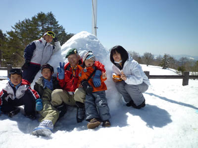 ▲宿舎をバックに。お天気がよくてほんとうによかったね。 ▲団委員長も入って思い出のかまくらでハイチーズ。