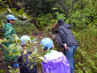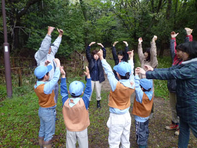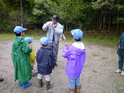 ▲明徳公園の森を雨具を着て探検しました。鳥の巣箱だ! ▲探検のあとはミニゲームで遊びます。この国宝級のスカウトネタは 昔の隊長?!
